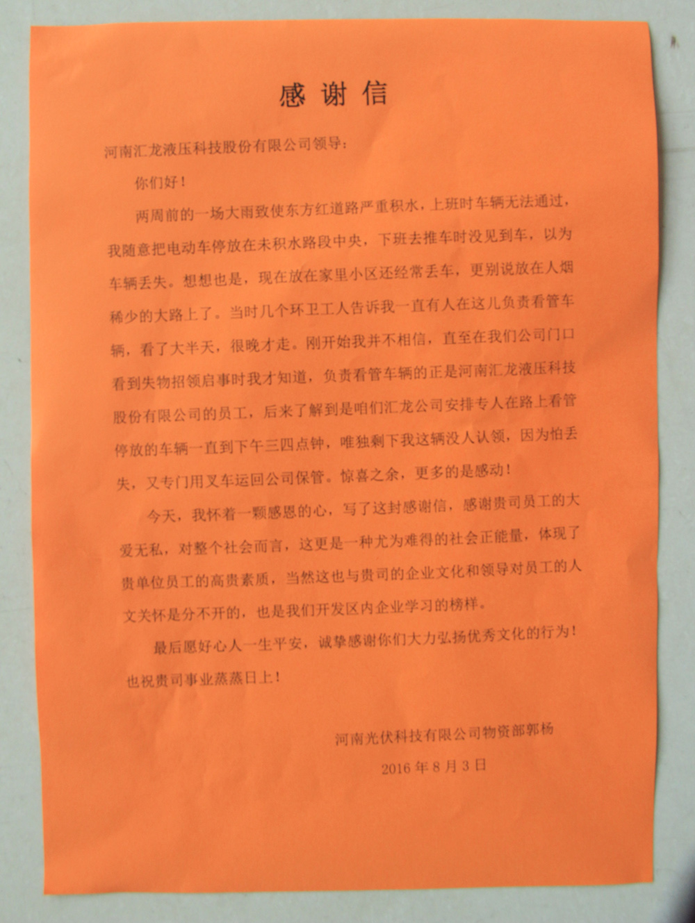 8月2日,協(xié)鑫的兩名員工來(lái)到我公司認(rèn)領(lǐng)電動(dòng)車,電動(dòng)車主人為協(xié)鑫物資部郭楊,郭楊說(shuō),她幾乎已經(jīng)放棄了尋找電動(dòng)車的希望,并把電動(dòng)車防盜鎖的鑰匙都給扔了。8月3日上午,我公司設(shè)備部員工幫忙將電動(dòng)車的鎖打開(kāi),郭楊高高興興地推走了電動(dòng)車。下午,郭楊又同協(xié)鑫行政部、供應(yīng)部、采購(gòu)部的幾名人員前來(lái)我公司進(jìn)行感謝,并帶來(lái)了一封感謝信。