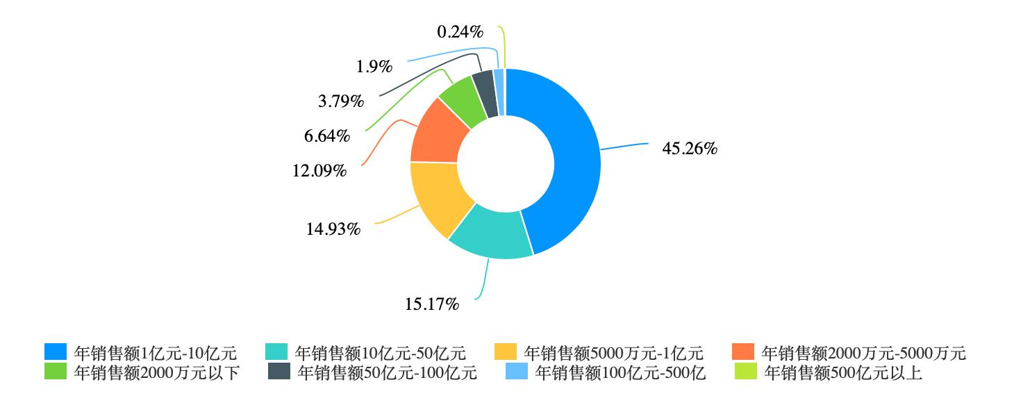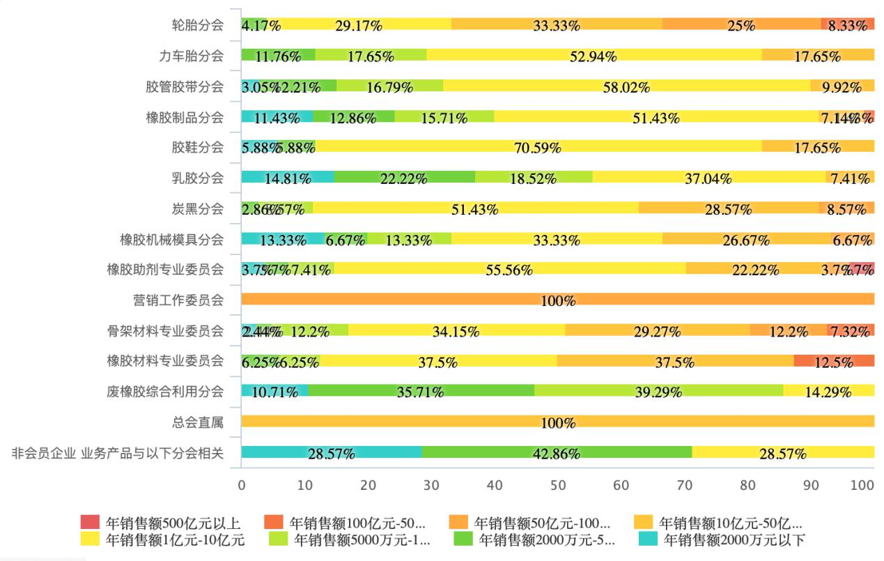 根據分會及專委會細分行業(yè)不同,企業(yè)經營規(guī)模有差異,橡膠行業(yè) 422 家參與調研答卷的企業(yè)中,45.26%的企業(yè)年銷售額在 1億-10 億元區(qū)間內;15.17%的企業(yè)年銷售額在 10 億-50 億元區(qū)間內;14.93%的 企業(yè)年銷售額在 5000 萬-1 億元區(qū)間內,其余如圖 3 所示。