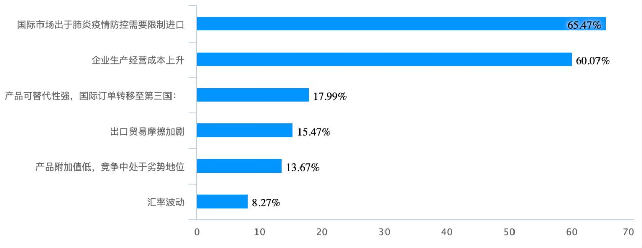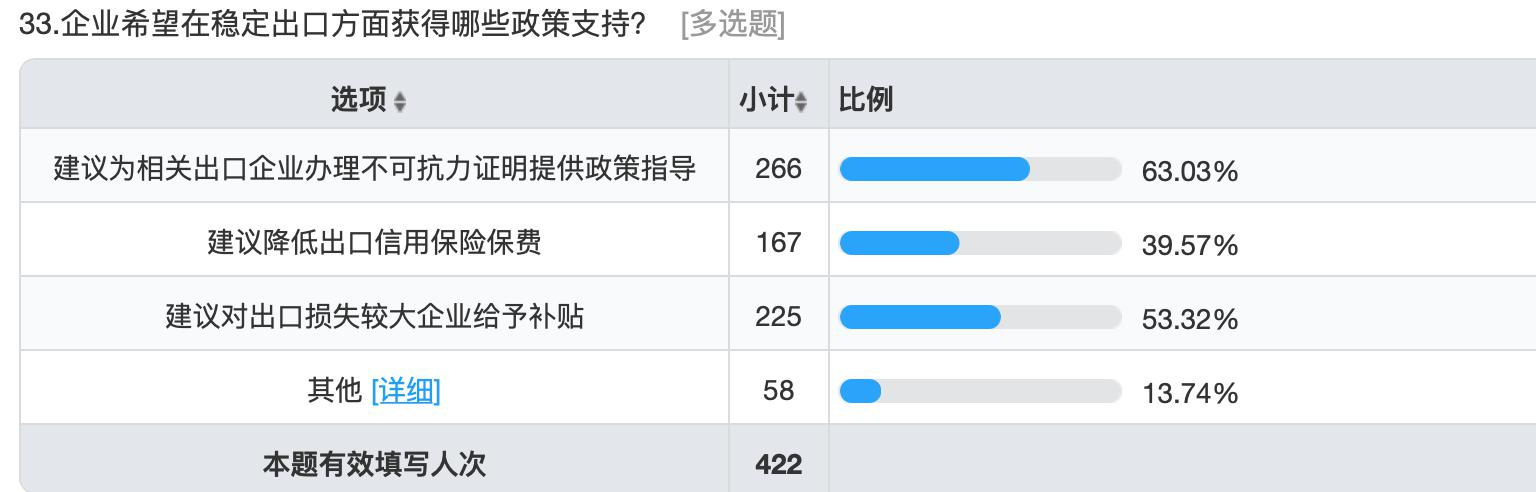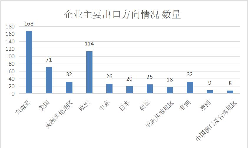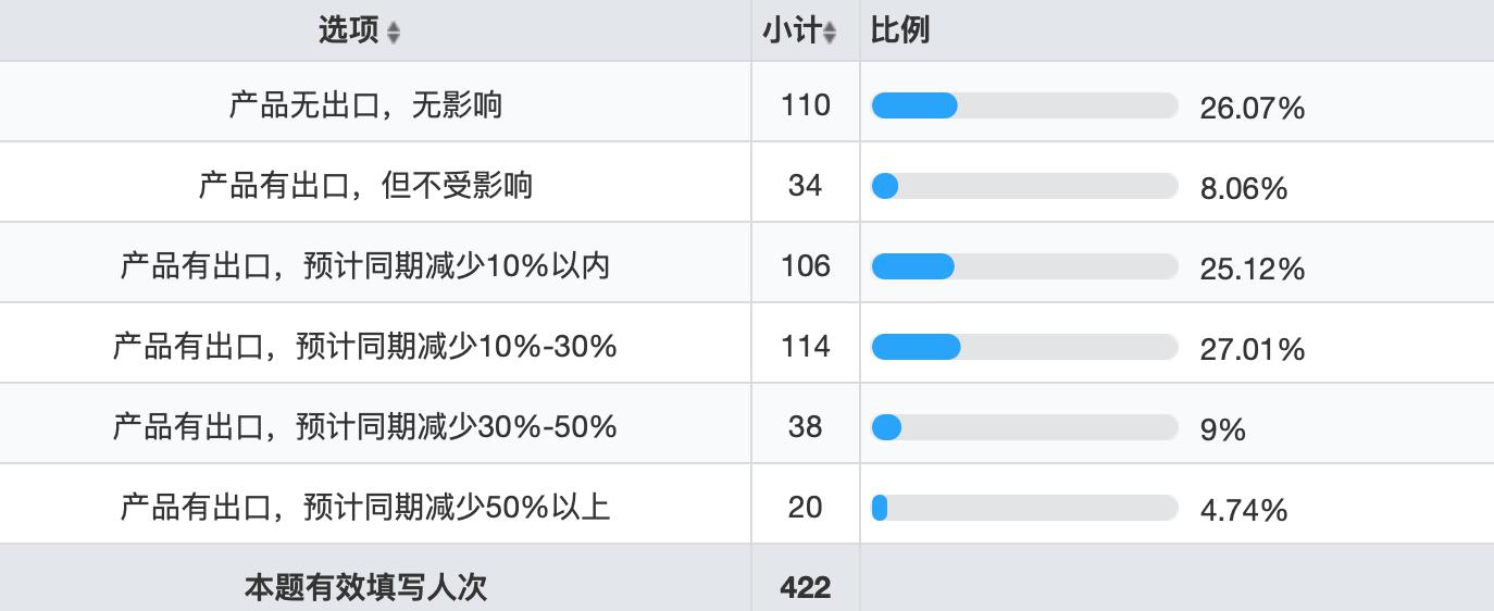 422 份問卷中,約 110 家企業(yè)無出口,占比為 26.07%,主要銷往國內市場;其余 312 家參與答卷的企業(yè)有出口業(yè)務,其中有 34 家企業(yè)或因產品不可替代、或因海外有工廠,迅速調整了布局、或因工廠靠近港口出貨便利等原因,出口沒有受到影響,其余企業(yè)均有著不