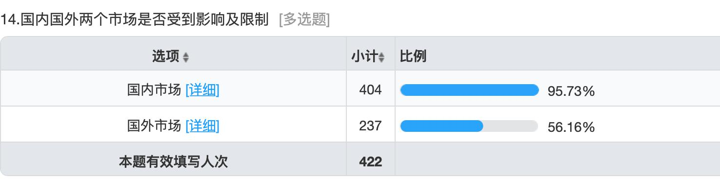 422 份問卷中,404 份認為國內市場受到了嚴重的影響,占比為95.73%(2 月 12 日時,250 份問卷中有 238 家企業(yè)認為國內市場受嚴重的影響,當時的占比為 95.2%,隨著時間的推移,很多企業(yè)也在逐漸恢復生產,努力減少疫情帶給企業(yè)的損失,但國內市場仍有災難性的影響。),同時有 237 份問卷,占比為 56.16%的企業(yè)也認為國外市場也受到到了不同程度的影響。