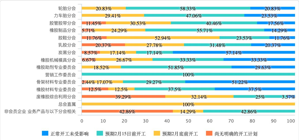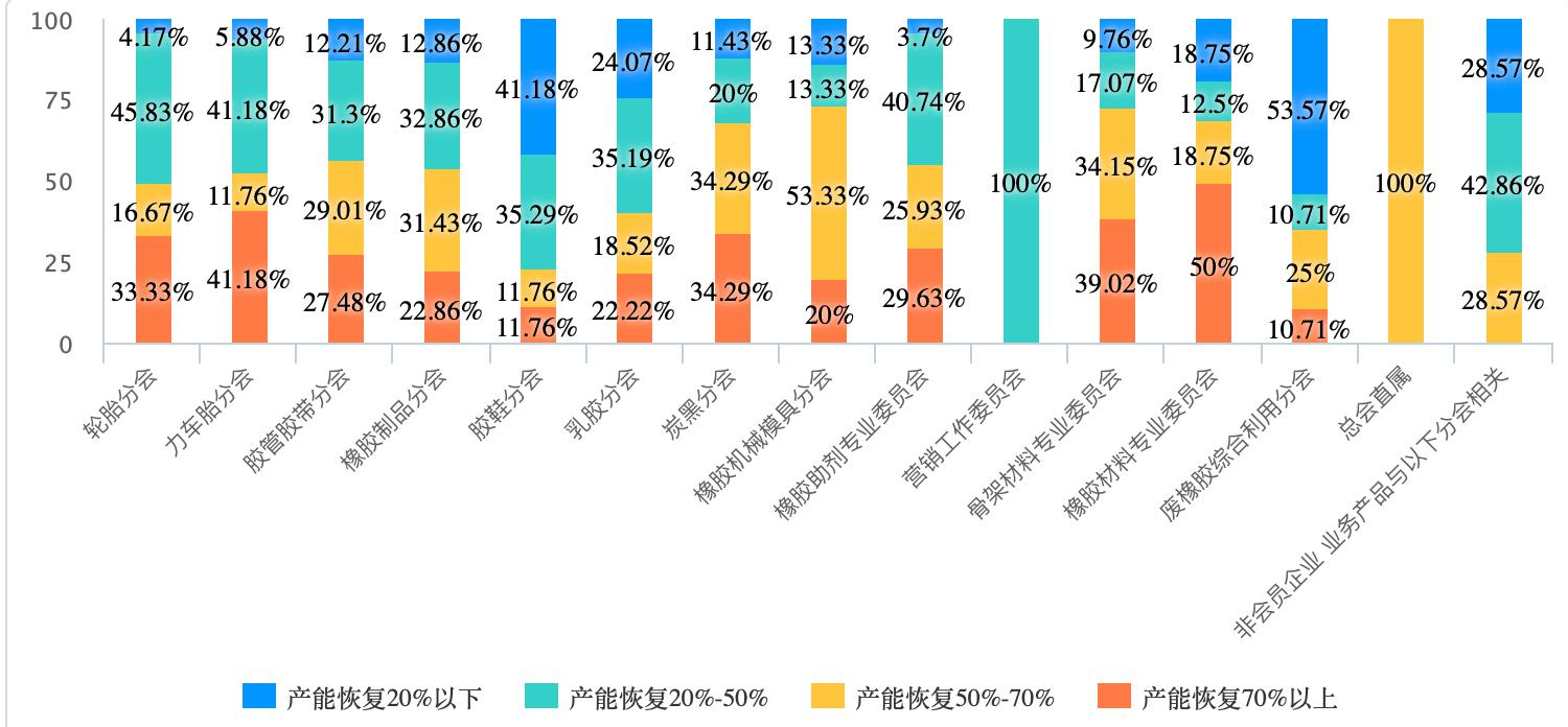 另外,從下圖 7 我們可以看出按照橡膠行業(yè)各細分行業(yè)看,我們的各分會及專委會會員的 2 月底前的產能恢復情況,產能情況恢復較好的有橡膠材料企業(yè)、骨架材料鋼簾線行業(yè)、炭黑行業(yè)等,需要說明的是受限于各分會及專委會的填報數量不同,企業(yè)類型不同,所以此項情況僅供參考。