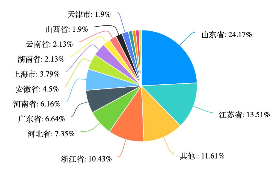 從答卷情況來看,山東省所占的份額較大,其次是江蘇省、浙江省,河北省和廣東省,選擇其他選項的 44 份答卷中,13 家來自遼寧省、10 家來自四川省、8 家來自江西省、,其余來自貴州、甘肅、廣西等省市自治區(qū)以及一家境外企業(yè)。